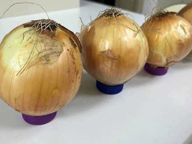 플라스틱이나 금속 병뚜껑을 일정 간격으로 놓고 그 위에 양파를 하나씩 올려주면 됩니다. 서로 겹치지 않도록 간격을 두는 것이 중요하며, 서늘하고 통풍이 되는 장소에 함께 보관하면 효과가 더 좋아집니다.