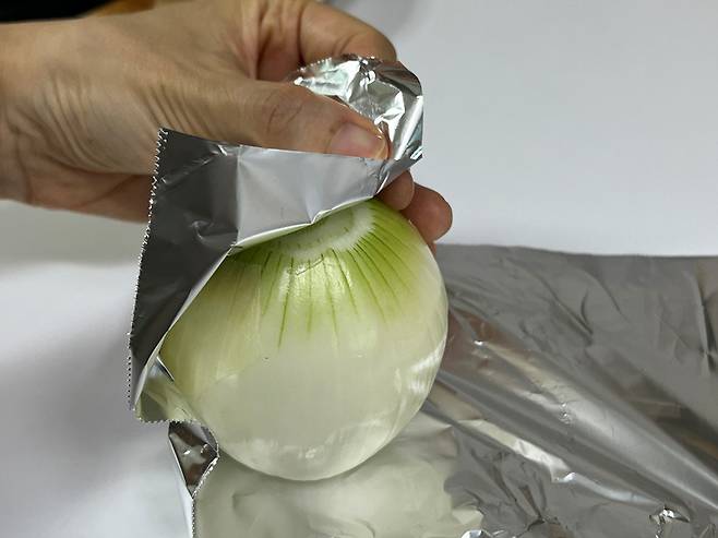 껍질을 깐 양파는 그대로 두면 수분이 빠르게 날아가면서 표면이 마르거나 물러지기 쉬워 보관에 더 신경을 써야 합니다. 이럴 때 알루미늄 호일로 감싸주면 공기와의 접촉을 줄여 수분 손실을 막고, 냉장고 안에서도 비교적 신선한 상태를 유지할 수 있습니다.