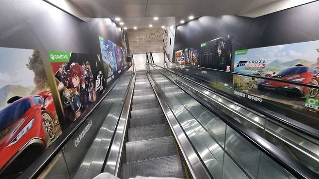 지하상가로 내려가는 에스컬레이터 입구입니다. 위에 게임관련 광고를 하고 있네요.