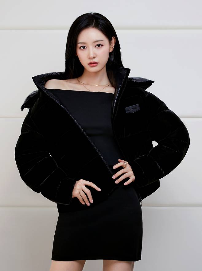 김지원의 쭉 뻗은 쇄골라인이 강조되는 블랙 드레스와 함께 착용한 ‘토리사’는 매트한 벨벳 소재의 숏패딩으로 실루엣을 살려주는 크롭 기장과 하이넥 디자인이 돋보이는 제품입니다.
