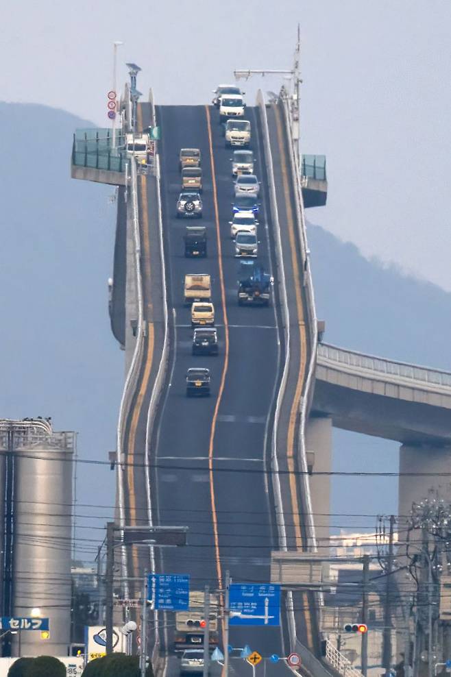 에시마 오하시 대교가 세간의 주목을 받은 데에는 한 장의 사진이 결정적 역할을 했습니다. 2015년 일본의 한 사진작가가 다리를 망원렌즈로 찍은 사진은, 다리가 마치 절벽처럼 치솟았다가 급하게 내리막을 타는 모습으로 보이게 했죠. 도로 위 운전 차량들도 마치 롤러코스터 맨 앞칸에 들어선 듯한 아슬아슬함이 강조됐습니다.