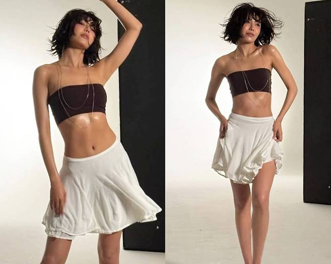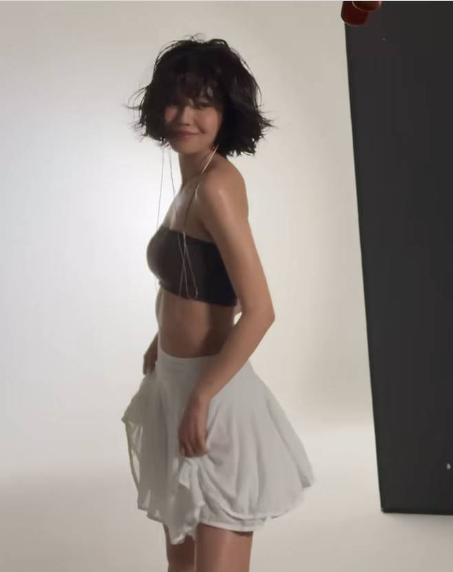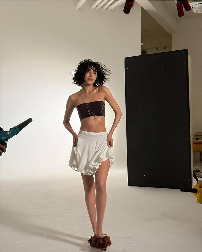 최수영은 초콜릿 브라운 튜브톱과 비대칭 화이트 스커트, 그리고 털이 가득한 브라운 퍼 슬리퍼를 매치해 독보적인 룩을 완성했습니다.