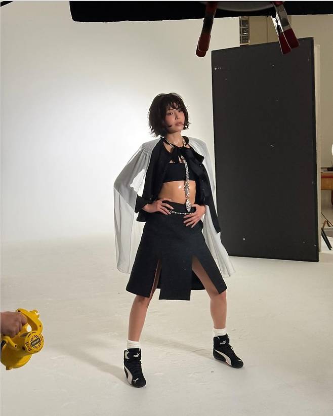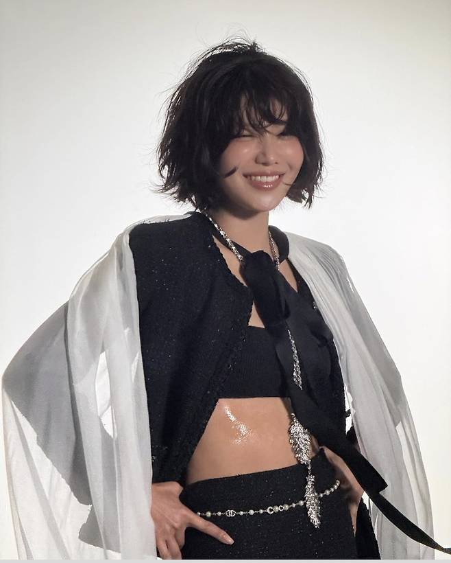 볼륨감 있는 흑단발 웨이브 헤어는 Y2K 감성과 복고 트렌드를 세련되게 섞어낸 스타일링의 핵심 포인트로 작용했습니다.