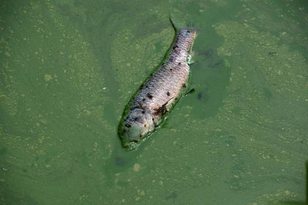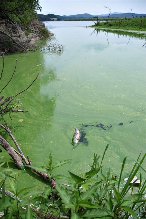 | ▲ 녹색 강물을 배경으로 죽어있는 거대한 강준치 한 마리. 무엇 때문에 죽었을까? |