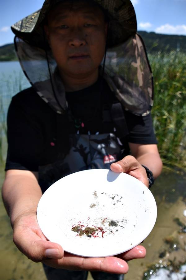 | ▲ 매곡취수장 건너 낙동강에서 채집된 붉은 깔따구 유충이다. 4급수 지표생물이다. 매곡취수장으로 4급수 낙동강물이 들어가고 있는 것이다. |
