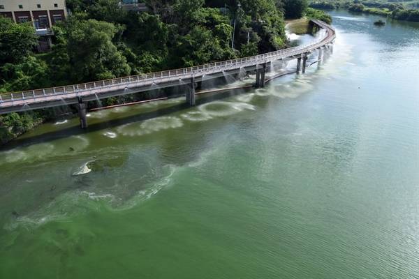 | ▲ 약간 열린 수문 위를 녹조라떼가 줄줄 흘러가는 창녕함안보의 모습이다. 녹조라떼의 배양소가 된 낙동강이다. |