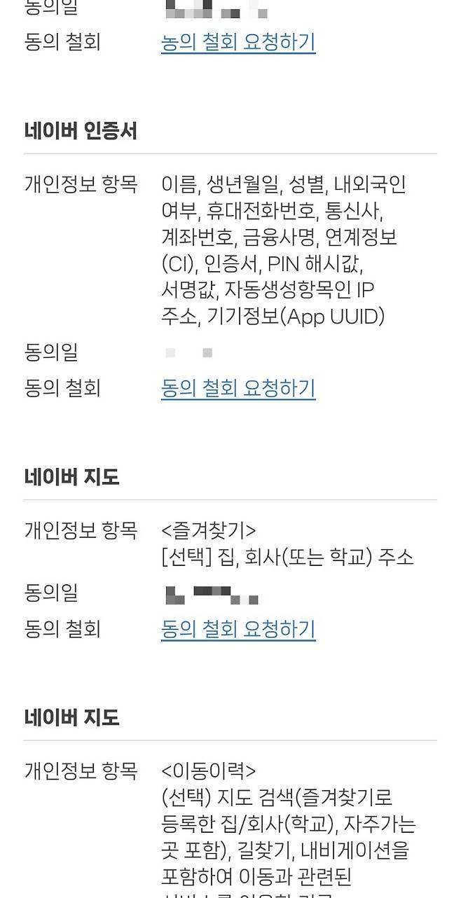 우수 이행 사례로 꼽은 네이버를 보면, 네이버는 네이버 지도나, 인증서, 카페 등 개별 서비스별로 개인정보 수집 항목을 공개하고, 각각 철회할 수 있도록 하고 있습니다. 다른 슈퍼앱 서비스들도 이처럼 개별 개인정보 수집 내역을 알기 쉽게 고지하고, 철회도 용이하도록 하라는 취지입니다.