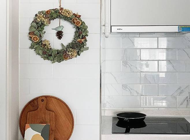 부엌의 좌측 기둥은 드라이플라워 리스랑 우드 소품으로 내추럴한 분위기를 연출했습니다.