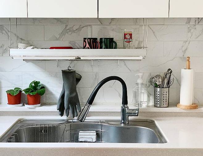 좁은 부엌은 그릇들이 많이 나와 있으면 더 좁아 보여서 설거지하는 공간도 깔끔하게 유지하려고 노력합니다.