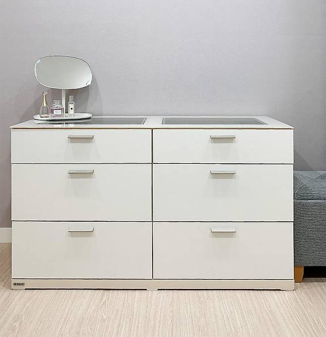 한쪽 벽 면에는 아일랜드 장을 하나 놓고 스툴이랑 거울 하나 사서 화장대로 쓰고 있어요. 화장품은 아일랜드 장에 넣어놓으니까 깔끔해 보여서 좋습니다.