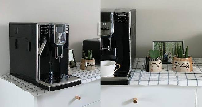 커피머신 옆에는 결혼 선물로 받은 도자기 화분을 데코로 놓았습니다.