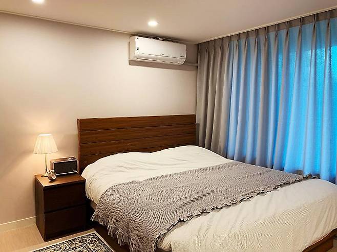 침실은 다른 공간과 다르게 그레이 톤의 벽지와 커튼, 원목 가구를 통해 따뜻하고 아늑한 컨셉으로 꾸몄습니다.