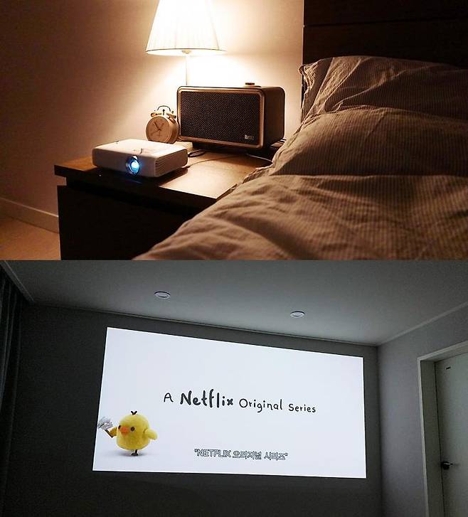 신혼집이 생기면 꼭 해보고 싶었던 빔 프로젝터. 함께 드라마나 영화 보길 좋아하는 저희 부부는 잘 쓰고 있어요. 화면이 크기 때문에 몰입도가 티비로 볼 때보다 더 높더라고요.