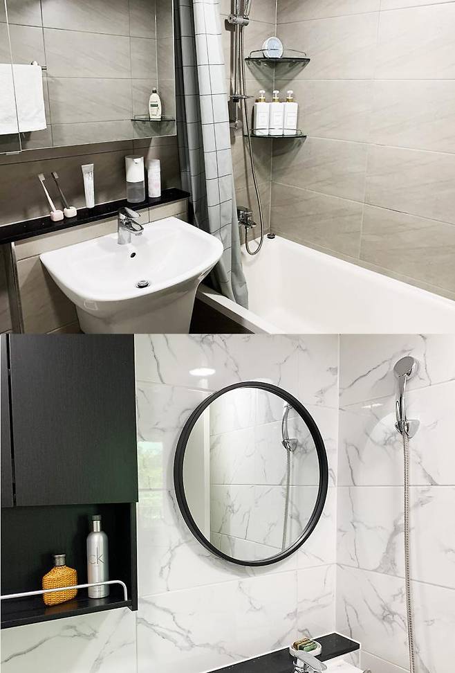 안방과 거실 화장실 2개가 있는데 자주 쓰는 거실 화장실은 그레이 톤으로, 건식으로 쓰는 안방 화장실은 화이트 톤으로 타일을 설치했습니다.