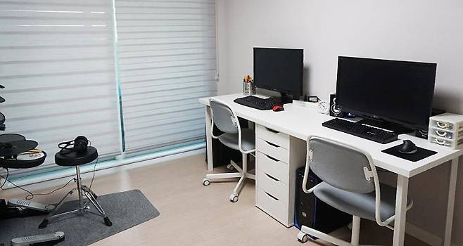 서재 겸 컴퓨터방은 화이트 계열 가구로 깔끔하게 정리했어요. 남편의 취미인 전자 드럼도 있는데 평소엔 거의 안쳐서 천을 덮어놓고 있습니다.