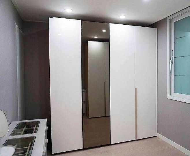 드레스룸은 옷 위에 먼지 쌓이는 것이 싫어서 옷장 문이 있는 키 큰 장으로 넣었습니다. 문 한쪽에는 거울 문을 달아서 유용하게 쓰고 있어요.