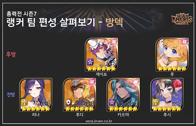 팀 편성 살펴보기 - 방덱제이브 뒷열, 카르마 앞열 형태 방덱도 조합 구성 자체는 이번 시즌에 크게 움직이지 않았습니다. 제이브와 리나, 루디, 카르마, 루시가 주전으로 활용되요. 이 외 챈슬러 등의 방덱 파츠가 루시 자리에 들어가기도 하나, 디버프 해제에 회복까지 있는 루시 선호도가 조금 더 높습니다. 리나가 다른 팀에 빠지는 것이 아니라면, 해당 조합이 고정이라고 봐도 괜찮은데요. 만약, 플라튼 마덱 등에 리나가 들어간다면 해당 자리는 엘리스가 대체합니다.