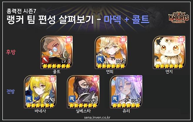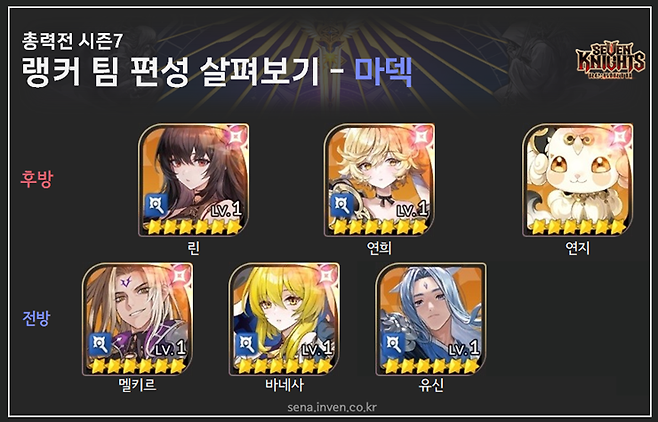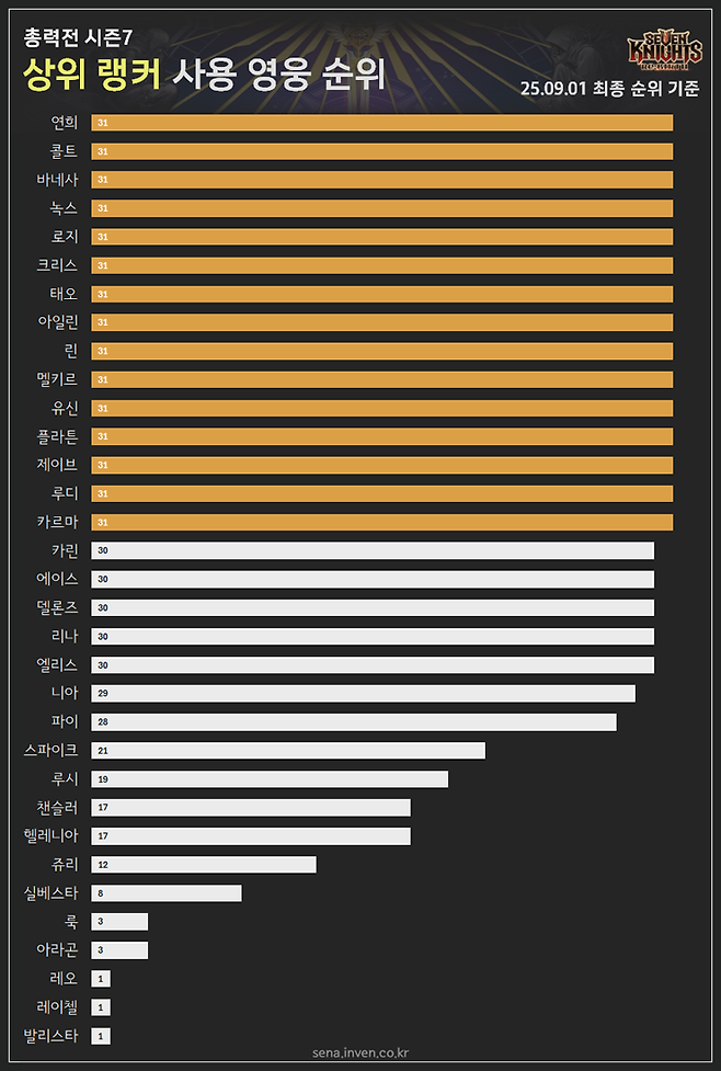 (구)세븐나이츠 영웅도 살펴봅시다. 시즌7에는 31명의 랭커 모두가 로지를 팀에 배치했고 파이는 28명이 활용했어요. 쥬리는 12명으로 그 순위가 가장 마지막입니다. 시즌6에는 7명의 랭커만 쥬리를 사용했는데, 밸런스 조정을 통해 어느정도 생존력을 갖춘 영향인지 픽률이 조금 늘었네요. 다만, 아직은 순수 마덱의 주전 자리에는 들어가지 못하는 모습이었습니다.