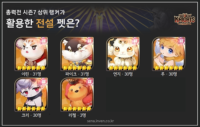 전설 펫의 흐름은 큰 변동이 없습니다. 공덱의 이린, 마덱의 연지, 즉사덱의 크리, 방덱의 파이크와 루가 주축이 되고 있어요. 그리고 간혹 리첼이 보이는 정도죠. 자료를 정리하다가 연지를 사용하지 않은 랭커의 정보가 궁금해 조금 살펴봤는데, 마덱에 연지 대신 리첼을 배치했더라고요.