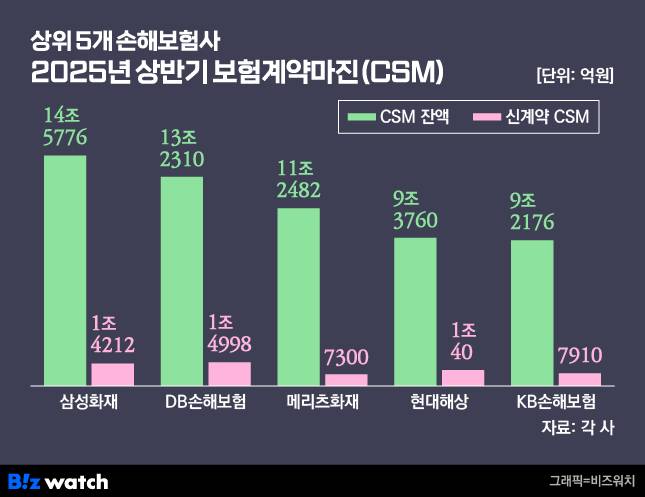 상반기 CSM 잔액 기준으로는 삼성화재가 14조5776억원으로 업계 1위를 기록했다. 이어 △DB손보(13조2310억원) △메리츠화재(11조2482억원) △현대해상(9조3760억원) △KB손보(9조2176억원) 순으로 집계됐다.