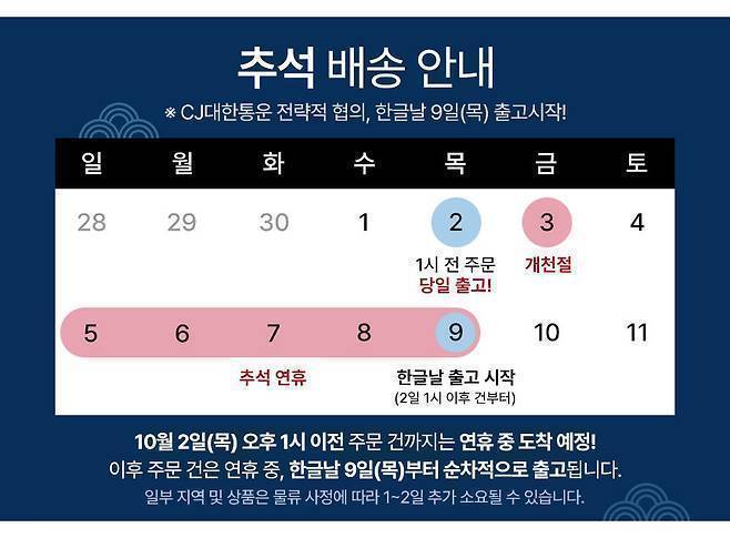 👇 추석 연휴 기간 배송일정을