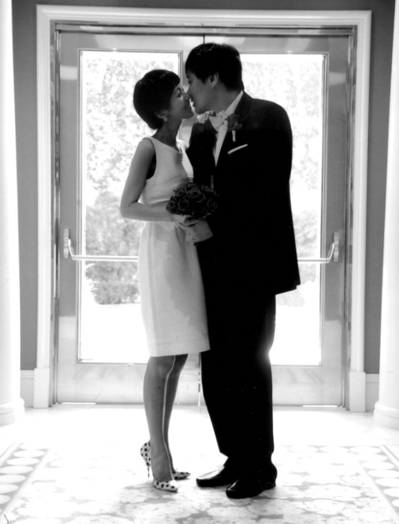 성당 같은 곳에서 올린 거 같죠? 당시 웨딩드레스는 짧은 미니스커트에 민소매 패션 스타일로, 항암치료 중이라 헤어스타일은 짧은데도 예쁘네요.