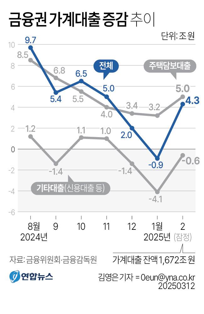 2월에는 토지거래허가제(토허제) 등 부동산 규제 완화 영향으로 주택담보대출이 급증하면서 4조3천억원 확대된 바 있다. 1월에 열 달 만에 9천억원 감소세로 전환했다가 다시 증가세로 돌아선 것이다.