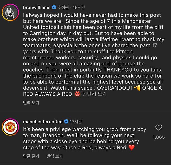 맨체스터 유나이티드에서 유소년 선수 시절부터 17년 뛴 풀백 브랜든 윌리엄스가 팀을 떠나며 팬들에게 감동적인 마지막 인사를 건넸다.