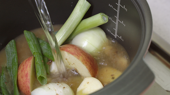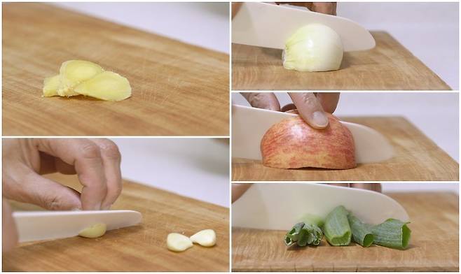 생강은 편 썰기, 마늘은 반토막내고, 양파도 반으로 자르고, 사과는 씨를 빼서 3 등분하고, 대파는 듬성듬성 잘라 주세요.