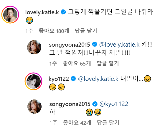 김희선의 댓글에 '그 말 책임져라. 제발 바꾸자'라며 반응하는가 하면, 송혜교의 댓글에는 '하......................😭🤣'라고 반응한 송윤아.