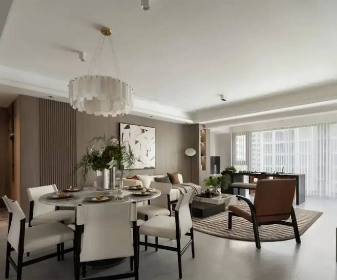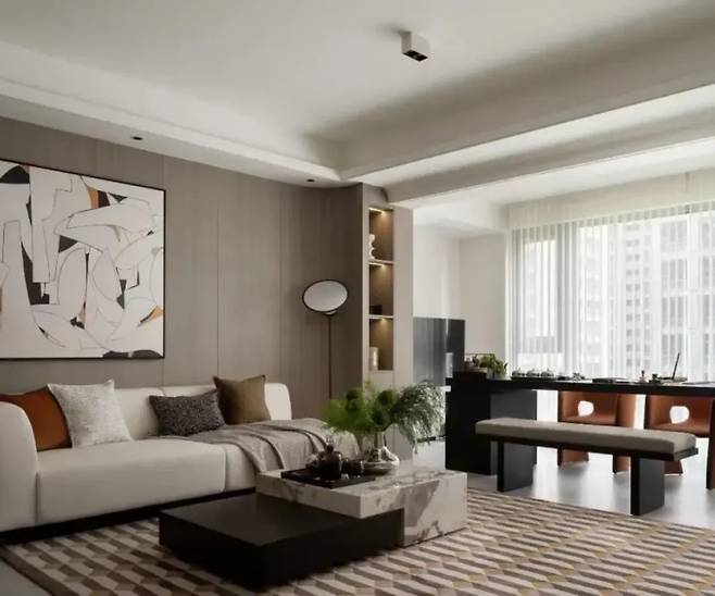 거실은 모던 미니멀 스타일로 디자인되었습니다. 오프화이트 소파, 다이아몬드 패턴의 카멜색 러그, 대리석 커피 테이블 위의 초록 식물은 시각적으로 조화로운 리듬을 만들어냅니다.