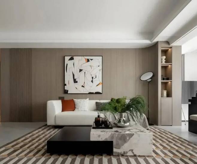 소파 뒤의 벽면은 밝은 호두나무 무늬목으로 마감되어 자연스러운 따뜻함을 더합니다. 벽에 걸린 추상화는 예술적인 터치로 공간에 세련미를 더하며, 따뜻한 소재와 차가운 소재가 조화롭게 어우러져 있습니다.