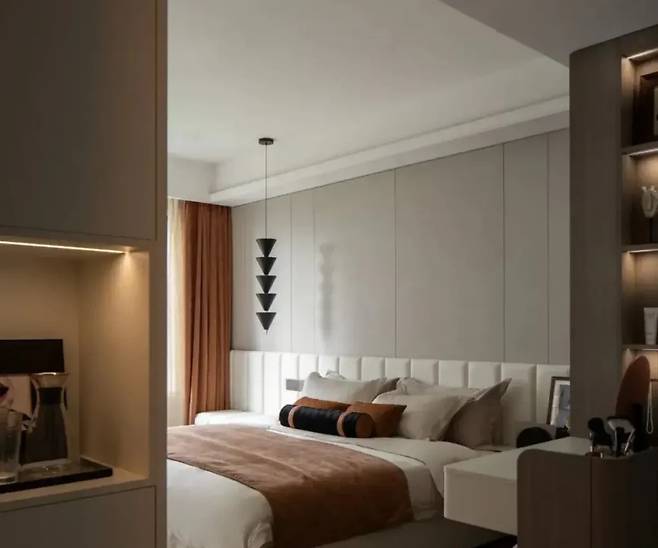 안방은 호텔의 고급스러움과 집의 편안함이 완벽하게 어우러집니다. 맞춤 제작된 워터 스테이션은 아침 햇살 아래 활력의 원천이 되며, 창문을 통해 들어오는 햇살과 커피 향이 라운지 의자와 어우러져 포근한 휴식 공간을 제공합니다.