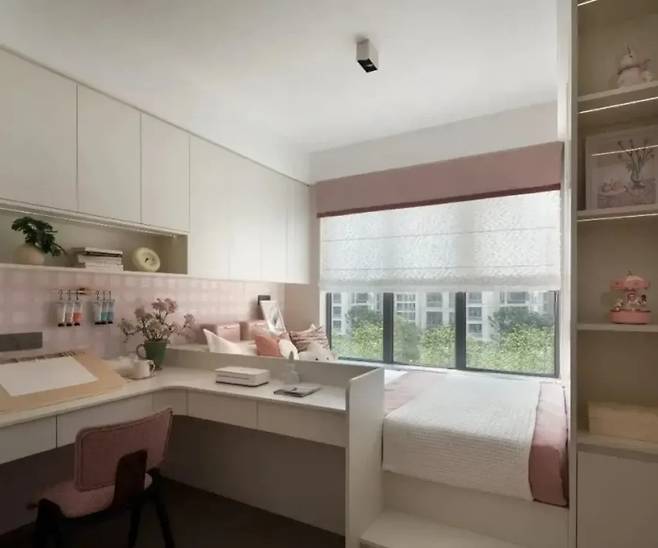 은은한 핑크빛이 벽과 침구, 장식품에 스며들어 실용성을 충족시키면서도 예술적 감성과 소녀의 감성을 함께 피어나게 합니다.