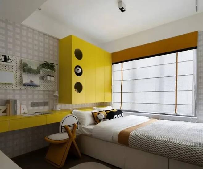 게임 캐릭터에서 영감을 받아 활기차고 생동감 넘치는 노란색을 공간의 주요 색으로 활용했습니다. 침대 위에 위치한 밝은 노란색 수납장은 마치 동화 속 보물 상자처럼 아름다움과 실용성을 완벽히 결합했습니다.