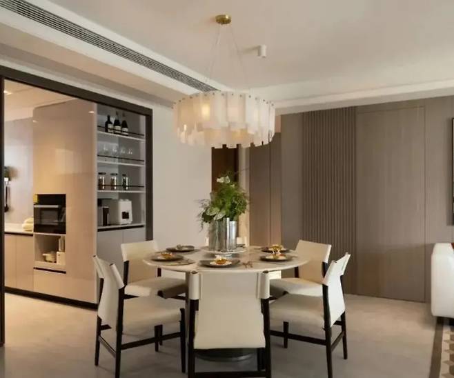 40평 아파트의 문을 열고 들어가면 예상치 못한 놀라운 광경이 펼쳐집니다. 거실 중앙에 자리 잡은 6인용 원형 테이블은 첫 번째로 눈길을 사로잡습니다. 일반적인 소파 중심의 거실 배치를 과감히 버리고, 가족이 함께 모일 수 있는 이 테이블을 공간의 중심으로 삼은 것입니다.