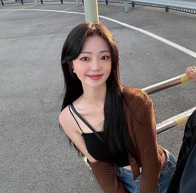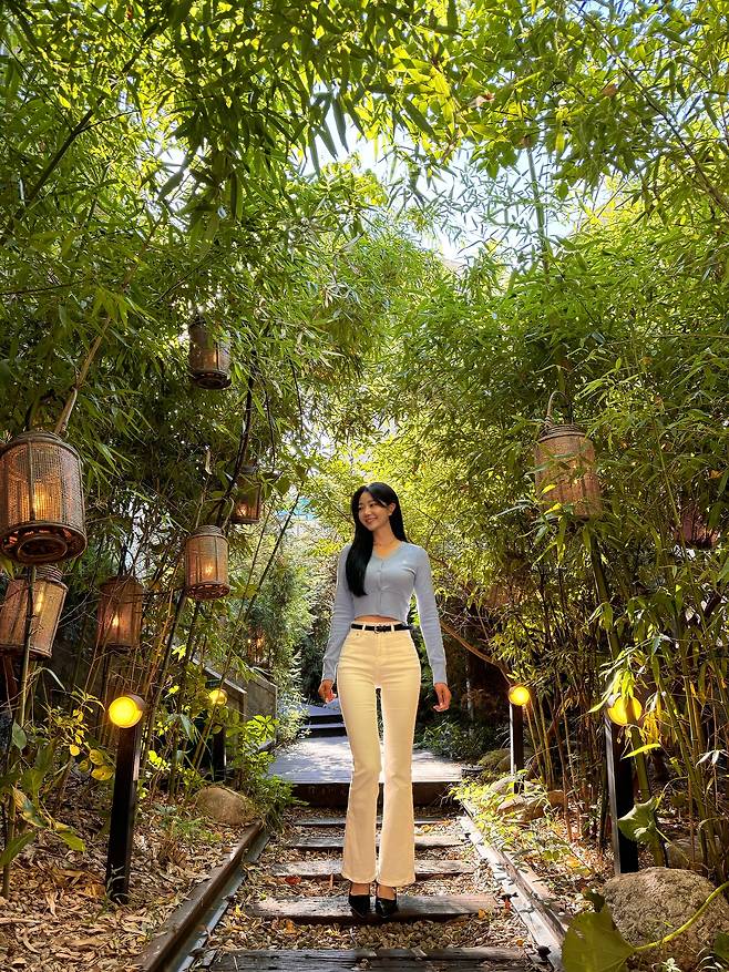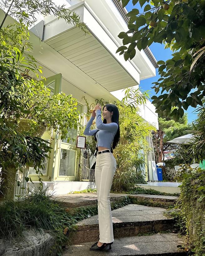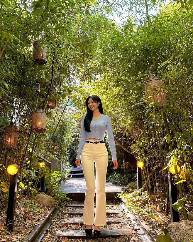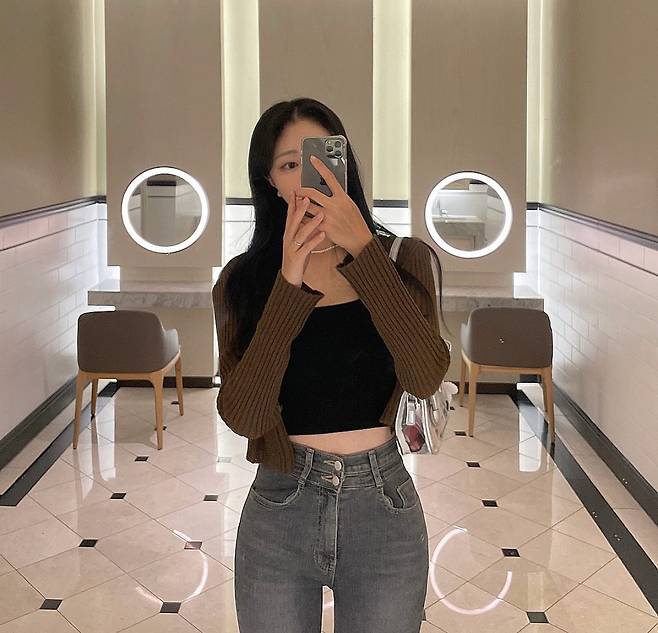 허리 강조를 위해 세미 크롭 기장의 가디건을 선택한 점이 관전 포인트.
