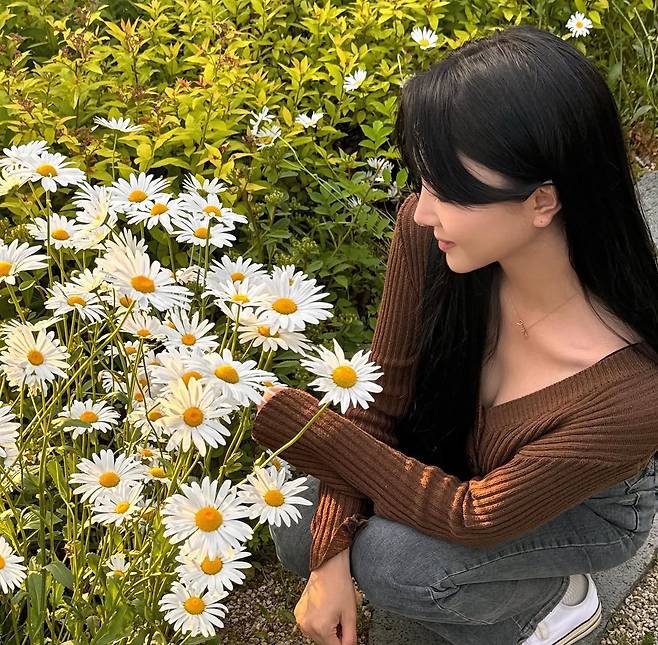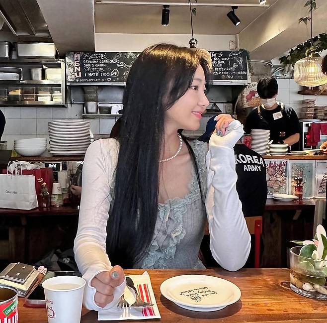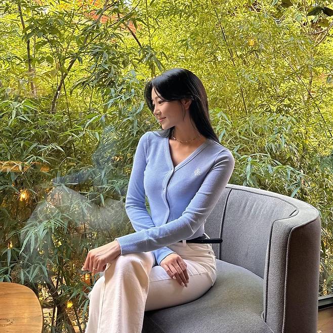 파스텔 블루 가디건은 얼굴 톤을 자연스럽게 밝혀 주는 동시에,