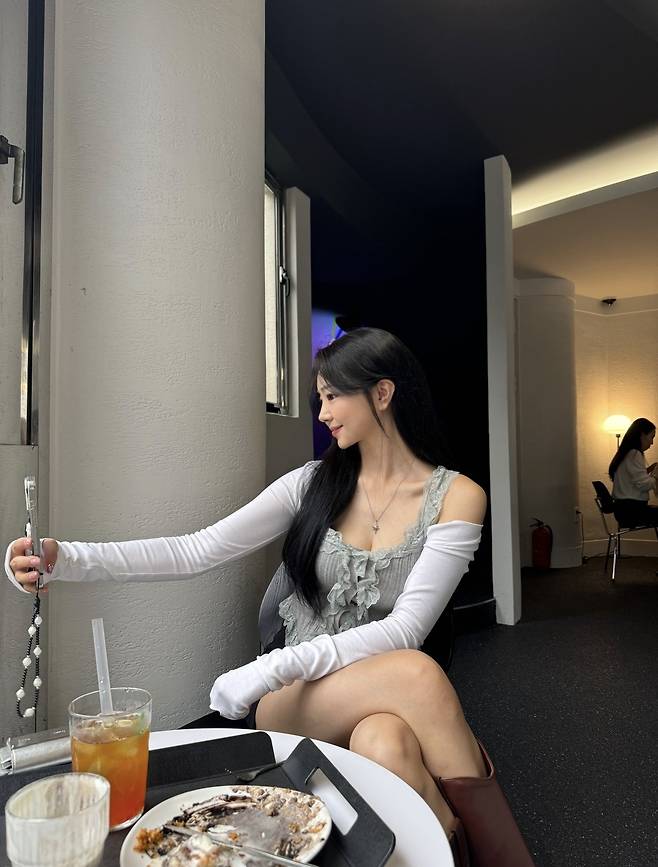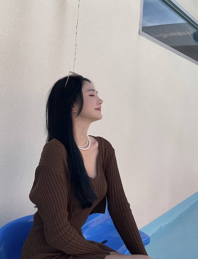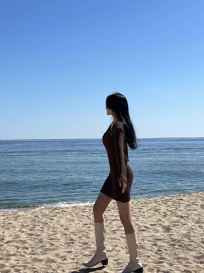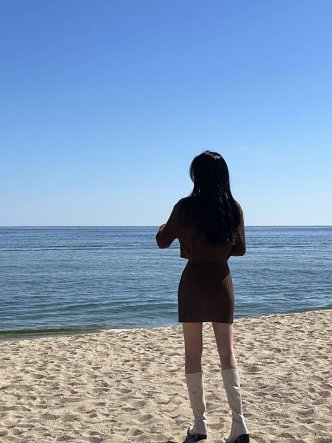 목선과 어깨 라인이 드러나야 니트 원피스 특유의 슬림한 실루엣이 살아나고,