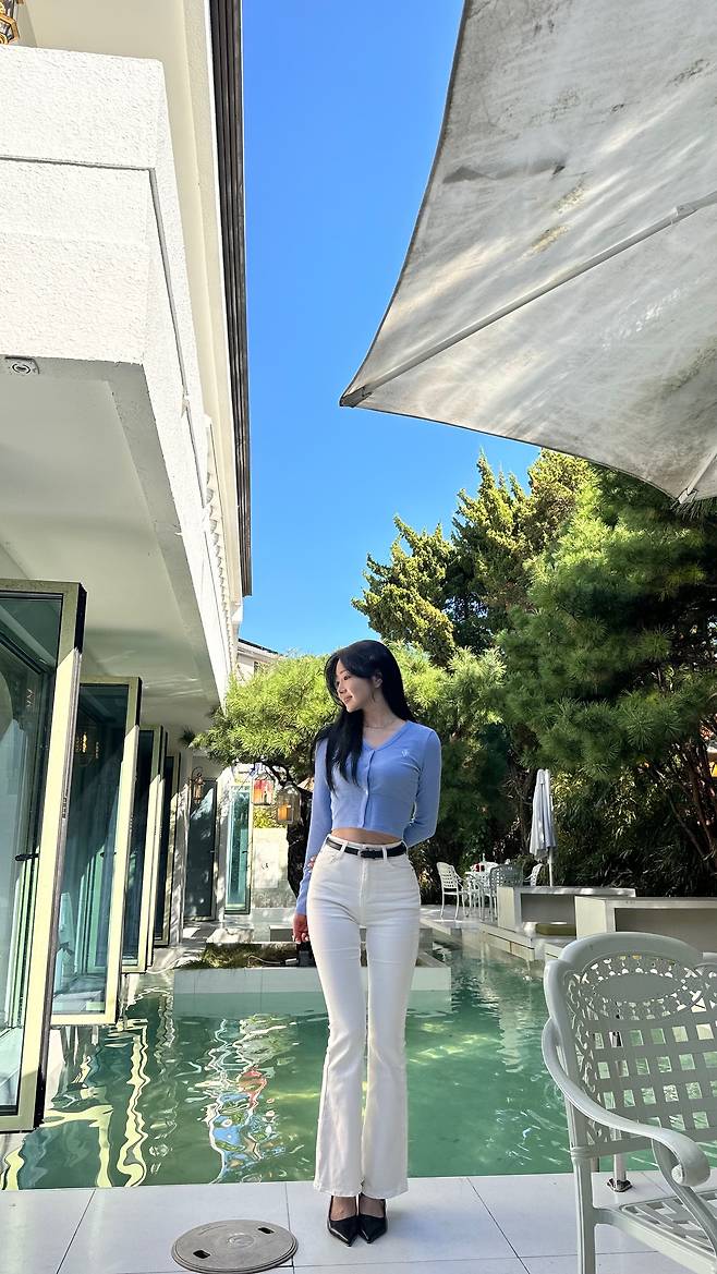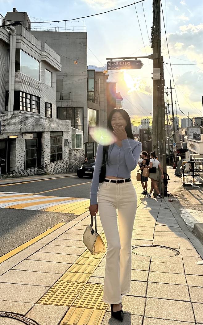 Look 1. ‘하늘색 가디건 + 흰색 부츠컷 팬츠’ 코디