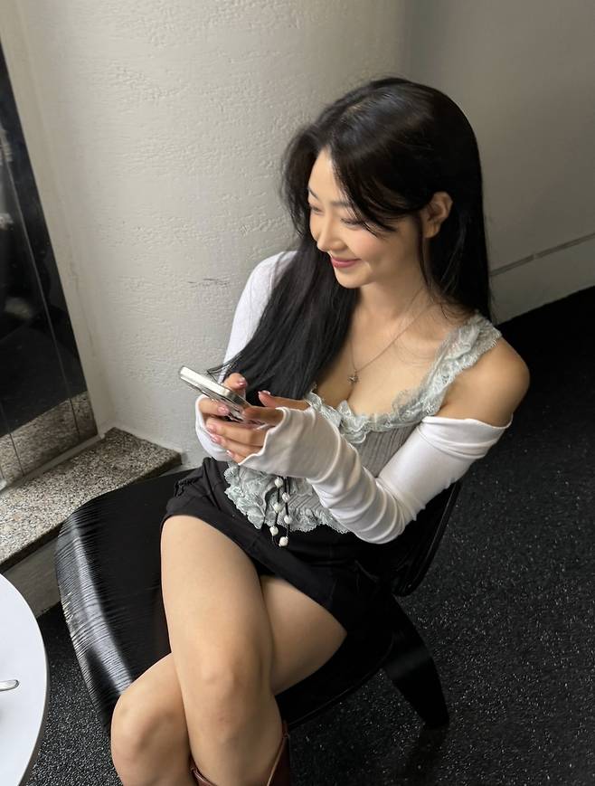 하의는 라이트 데님 쇼츠를 매치해 러블리·캐주얼 밸런스를 맞췄습니다.