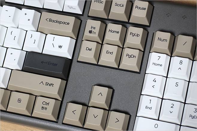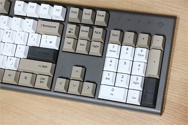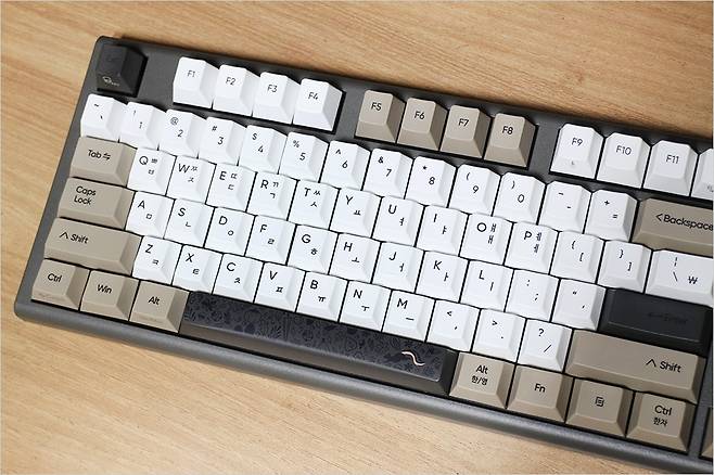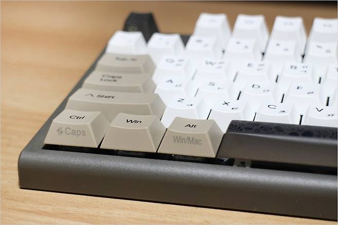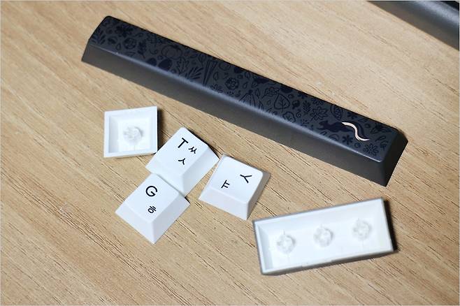 키캡은 염료승화 방식 PBT 키캡입니다. 염료승화 방식은 유해 물질 배출이 적고 다양한 소재에 인쇄 방법으로 쓰일 만큼 검증된 방식인데, 키보드에서는 주로 고급형의 이미지가 있고 선명한 표현과 표면이 매끄럽고 균일한 질감 등이 연료 승화 방식의 특징입니다.