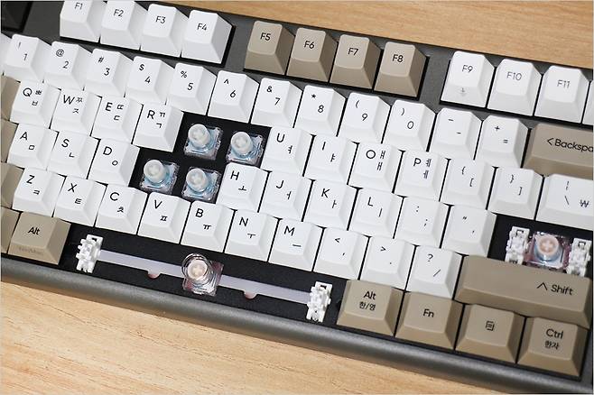 타건감은 사근 사근 거리면서도 부드러운 느낌입니다. 소음도 스페이스바 부분을 제외하면 상당히 조용한 수준입니다. 55g 모델의 경우 촉각 피드백이 확실한 편이며 가볍게 눌러지면서도 묵직한 감각을 유지합니다. 키캡이 흔들린다거나 그런 느낌없이 보다 안정적인 타건이 가능했으며 전체적으로 견고함이 확실하게 느껴집니다.