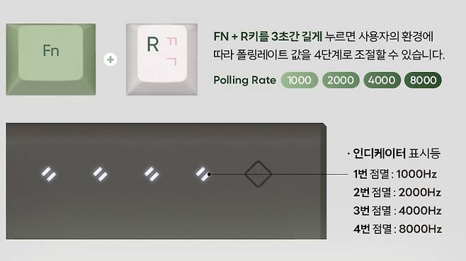 그리고 래피드 트리거 지원 무접점 키보드 답게 최대 8000Hz 폴링 레이트를 지원합니다. 일반 적인 작업이라면 1000Hz 에서 충분하지만 래피드 트리거가 주가되는 게임을 즐길때는 8000Hz 주사율로 즐기면 됩니다. FN+R 키를 3초동안 누르면 우측 상단 램프가 단계별로 점등 됩니다. (예 3단계 4000Hz 설정, 램프 3번 깜빡)
