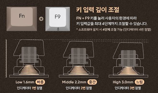 그리고 소프트웨어 없이 하드웨어 자체적으로 스트로크 조절이 가능하지만 게임에 따라 키의 입력성을 높이기 위해 소프트웨어를 설치 후 보다 정밀한 스트로크 높낮이 설정이 가능합니다. 전용 소프트웨어를 설치하면 총 4단계까지 가능하며 하드웨어 설정은 FN+F9 키를 누르면 램프 횟수에 따라 단계별 설정이 가능합니다.