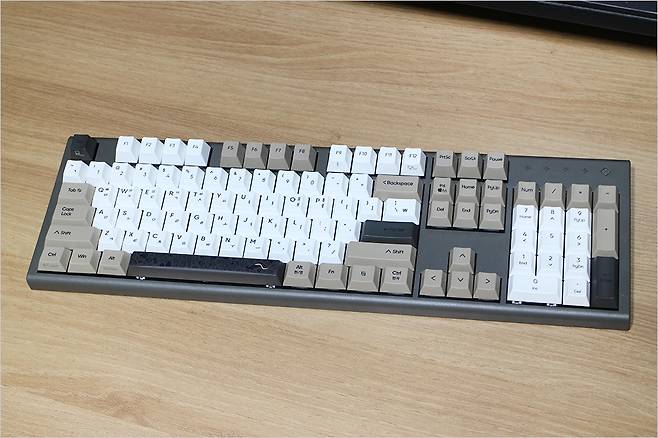 기본 디자인은 104키 풀배열 형태이며 알루미늄 상판을 적용했습니다. 다람쥐 모델이라 전체적으로 알루미늄의 시원하면서도 자연의 느낌을 줍니다. 그리고 무게가 약 1.15kg 이기 때문에 안정적인 거치를 기대할 수 있습니다. 실제로 흔들림이 거의 없는 안정적인 거치가 가능했습니다.