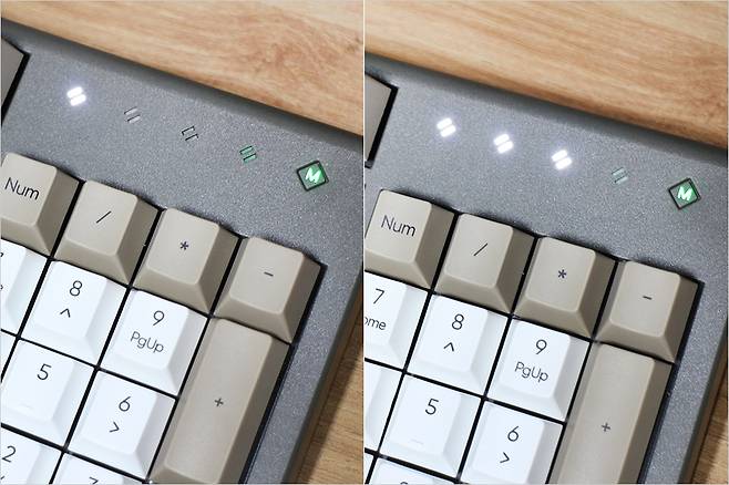 그리고 기본적으로 CAPS LOCK 과 같은 동작 사항은 우측 상단 램프를 통해서 확인할 수 있으며, M 문자는 매크로 기능을 위한 ON/OFF 키 입니다. 우측 숫자 키를 잘 사용하지 않는다면 해당 키를 통해 매크로 모드로 변경 후 사용할 수 있습니다.