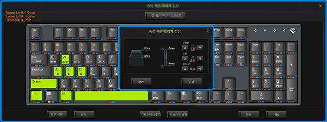 래피드 트리거 설정은 자주 사용하는 키를 선택후 원하는 트리거로 설정이 가능합니다. 상한선이 0.3mm까지 설정이 가능해서 범위가 넓은 편입니다. FPS 게임을 즐길 때 점프키나 WASD 키를 설정해주는 것이 좋고, 그외의 게임에서 자주 사용하는 키들을 설정 후 즐기면됩니다.