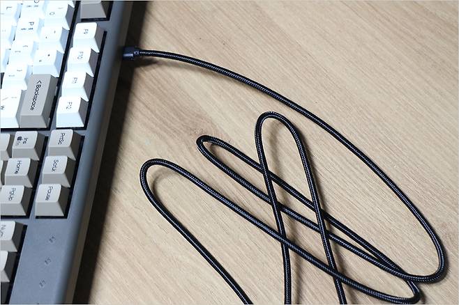 케이블 연결 방식은 Type-C 타입이며 케이블은 선꼬임 방지 설계를 확인할 수 있습니다. 1.8m 길이라 확실히 널널한 느낌이며 견고하며 멀리 떨어져있는 데스크탑에도 쉽게 연결 후 사용할 수 있습니다.