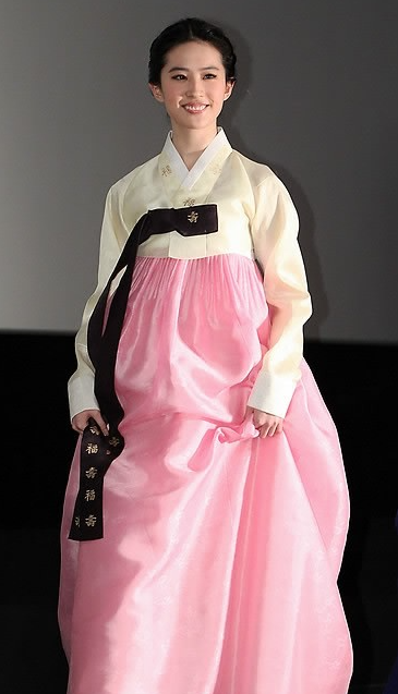 유역비는 영화 '천녀유혼' 기자시사회에서 분홍색 치마에 파스텔톤 저고리를 입고 등장했습니다.